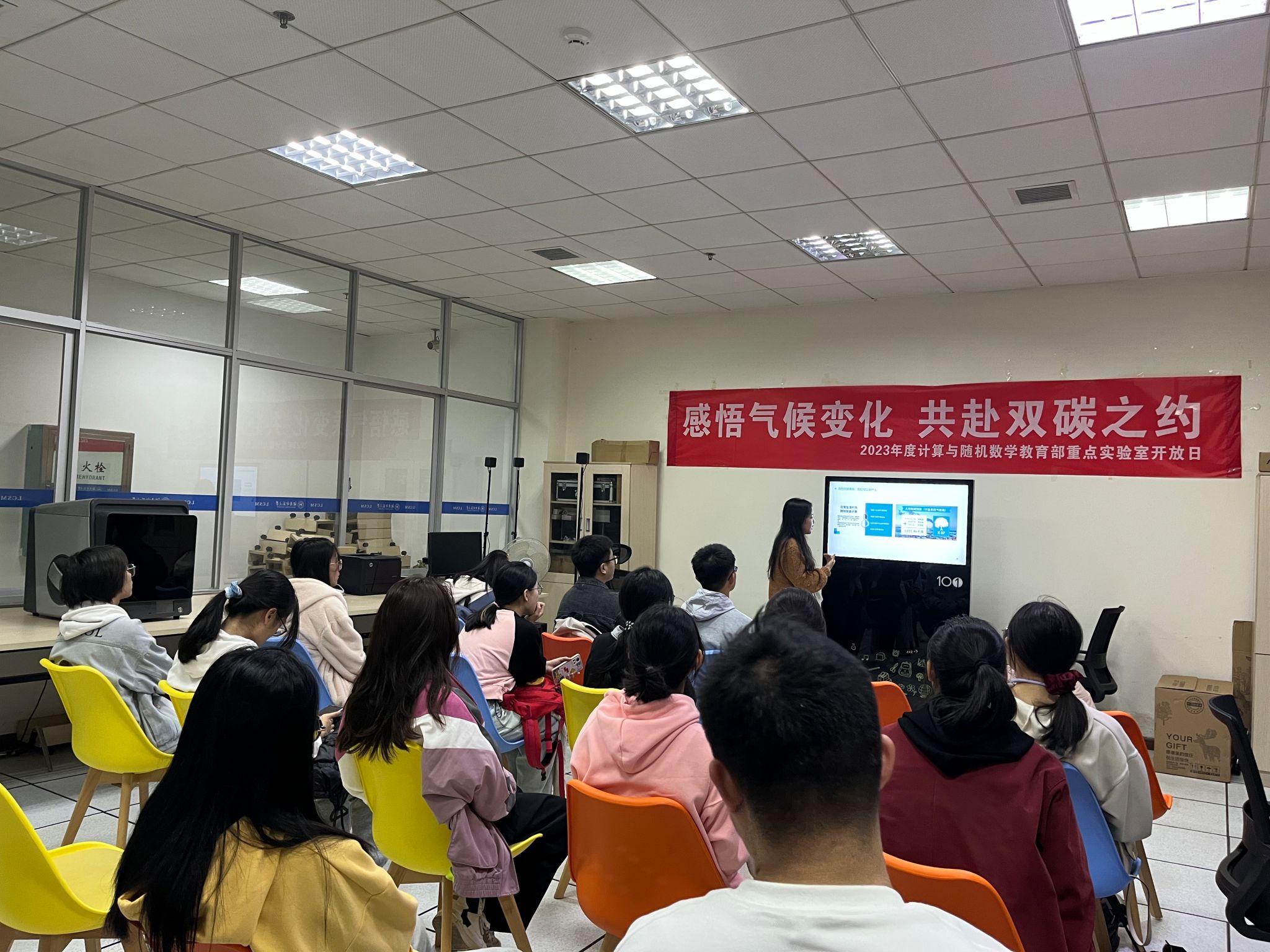 为了提高同学们的科学素养、普及最新科研成果和科技发展动态,11月23日下午计算与随机数学教育部重点实验室在里仁楼二楼开展了主题为“感悟气候变化,共赴双碳之约”的科普开放日活动。mansion88明升30名本科生参加此次活动。