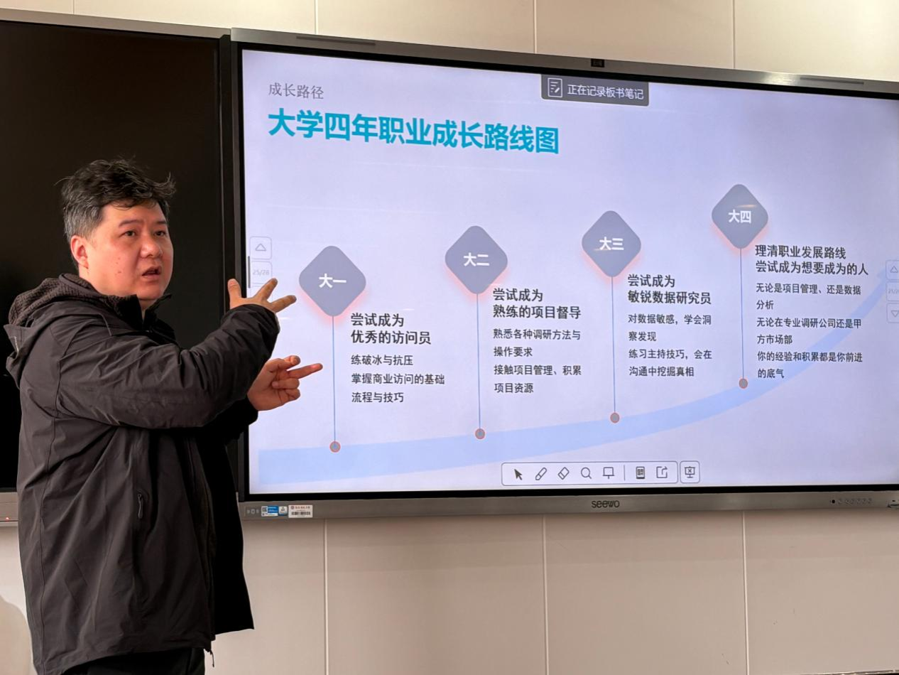 (通讯员 李林针)312日下午,mansion88明升mansion88明升与“数字经济”现代产业公司联合举办“市调大赛的实战逻辑与职业能力建设”专题报告。报告邀请长沙联拓企业管理咨询有限责任公司合伙人、中国商业统计学会会员单位代表王鑫担任主讲嘉宾。活动吸引了公司众多备战全国老员工市场调查与分析大赛的本科生、研究生到场参与。